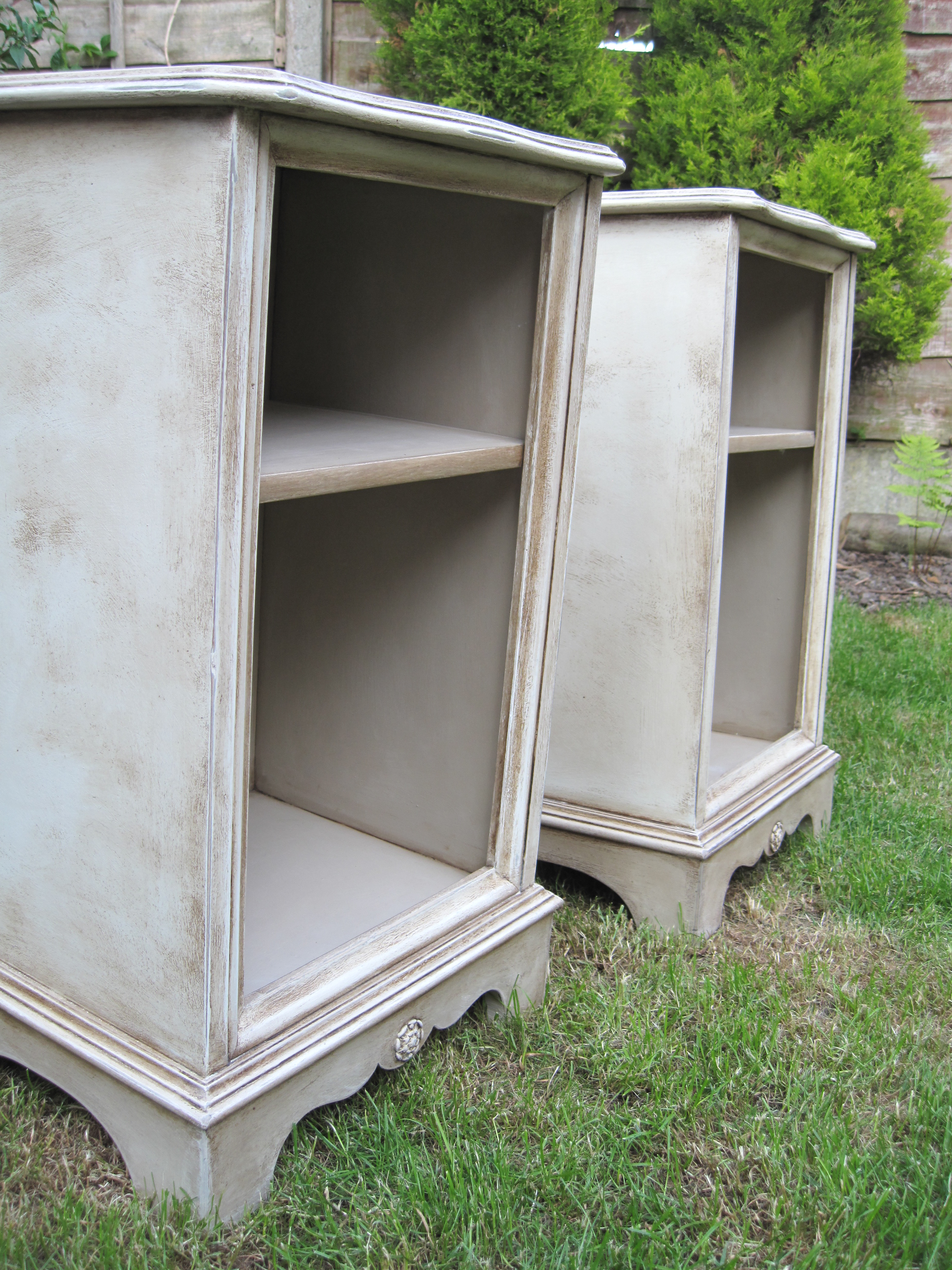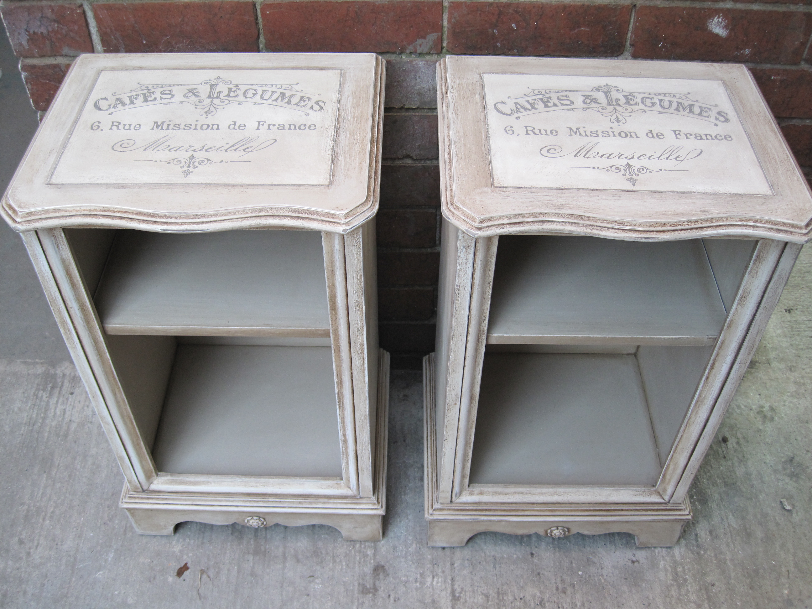 Those two speakers were transformed into bedside cabinets as a commission project in June 2013. Hand painted with Annie Sloan Whites and Country Greys, decorated with French Typography. Heavily distressed and aged with Dark Wax.