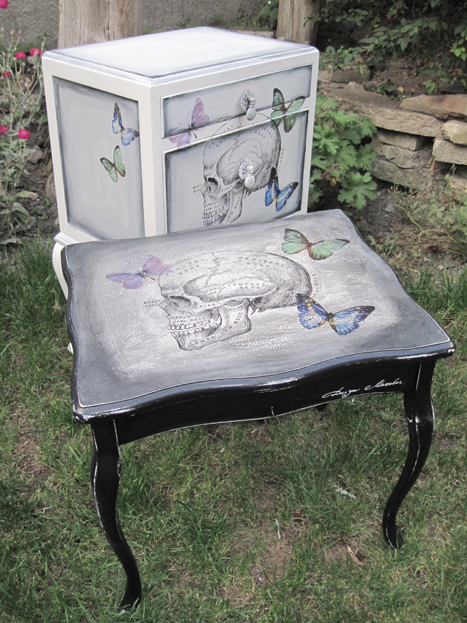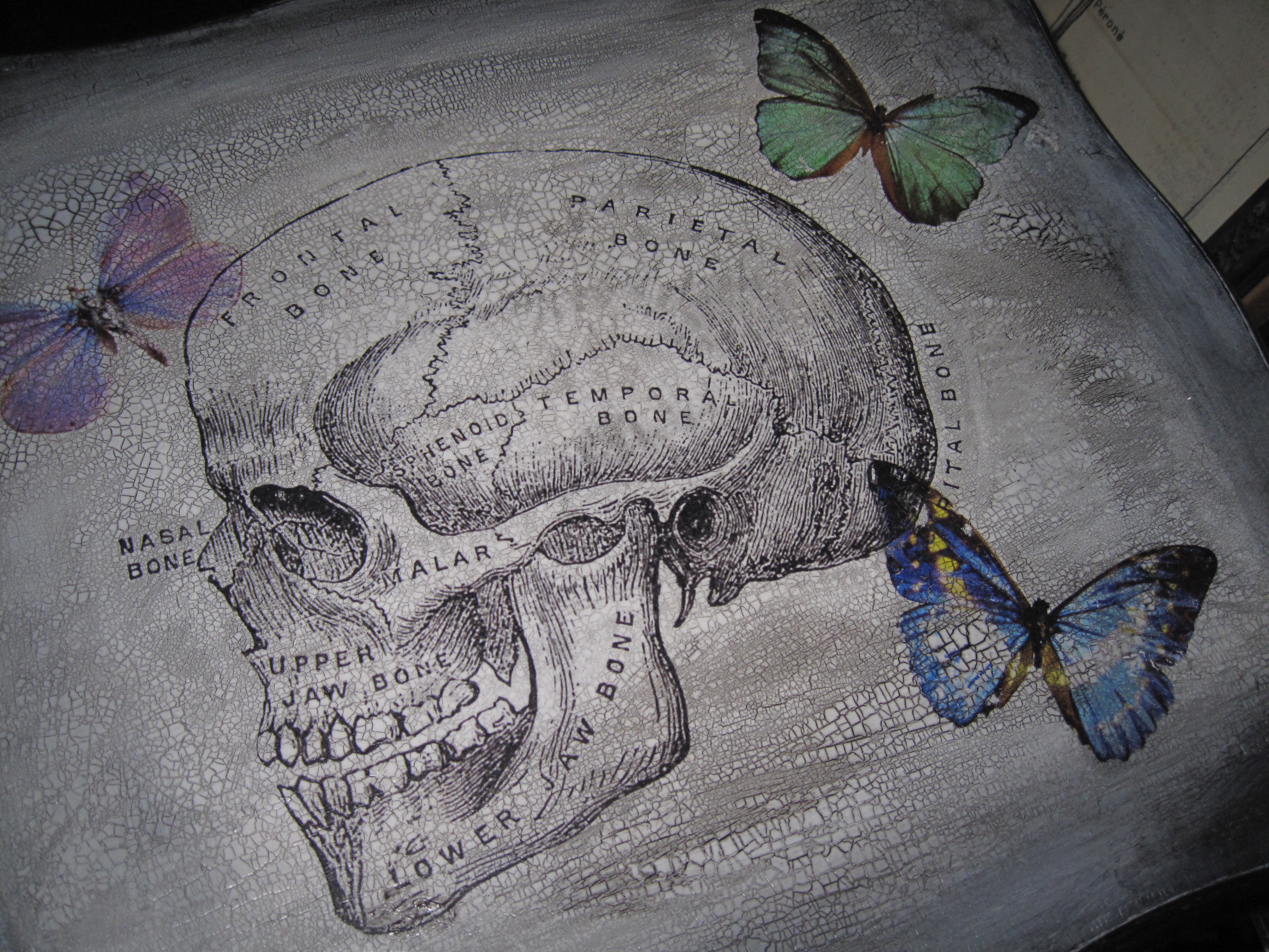 Old dictionary skull and digital butterflies design on the top.