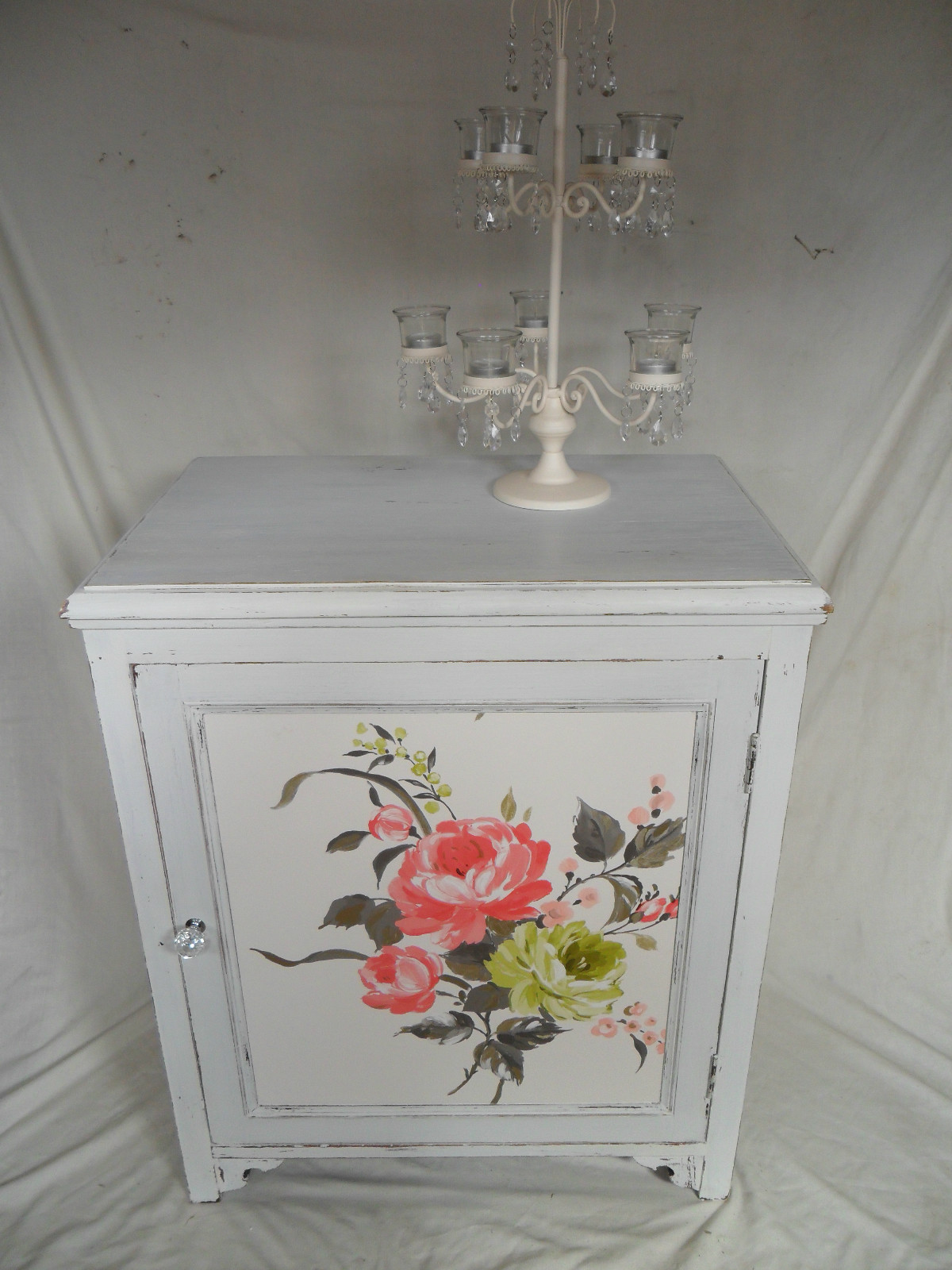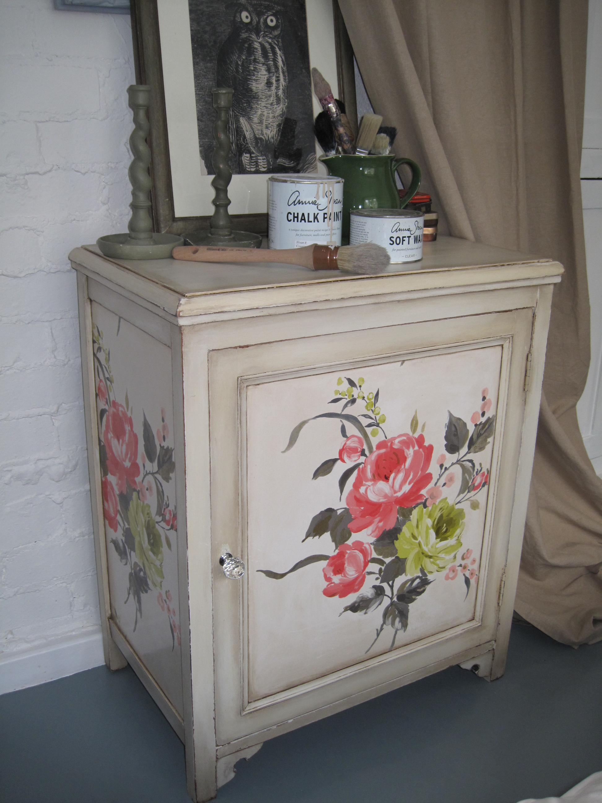 This Pretty Linen Cupboard updated to the customer requirements. It didn’t match the existing interiors and has been repainted with mixture of Country Grey, Cream and Old White. Varnished on decoupaged panels then waxed with Annie Sloan Clear Wax and aged with Dark Wax.
