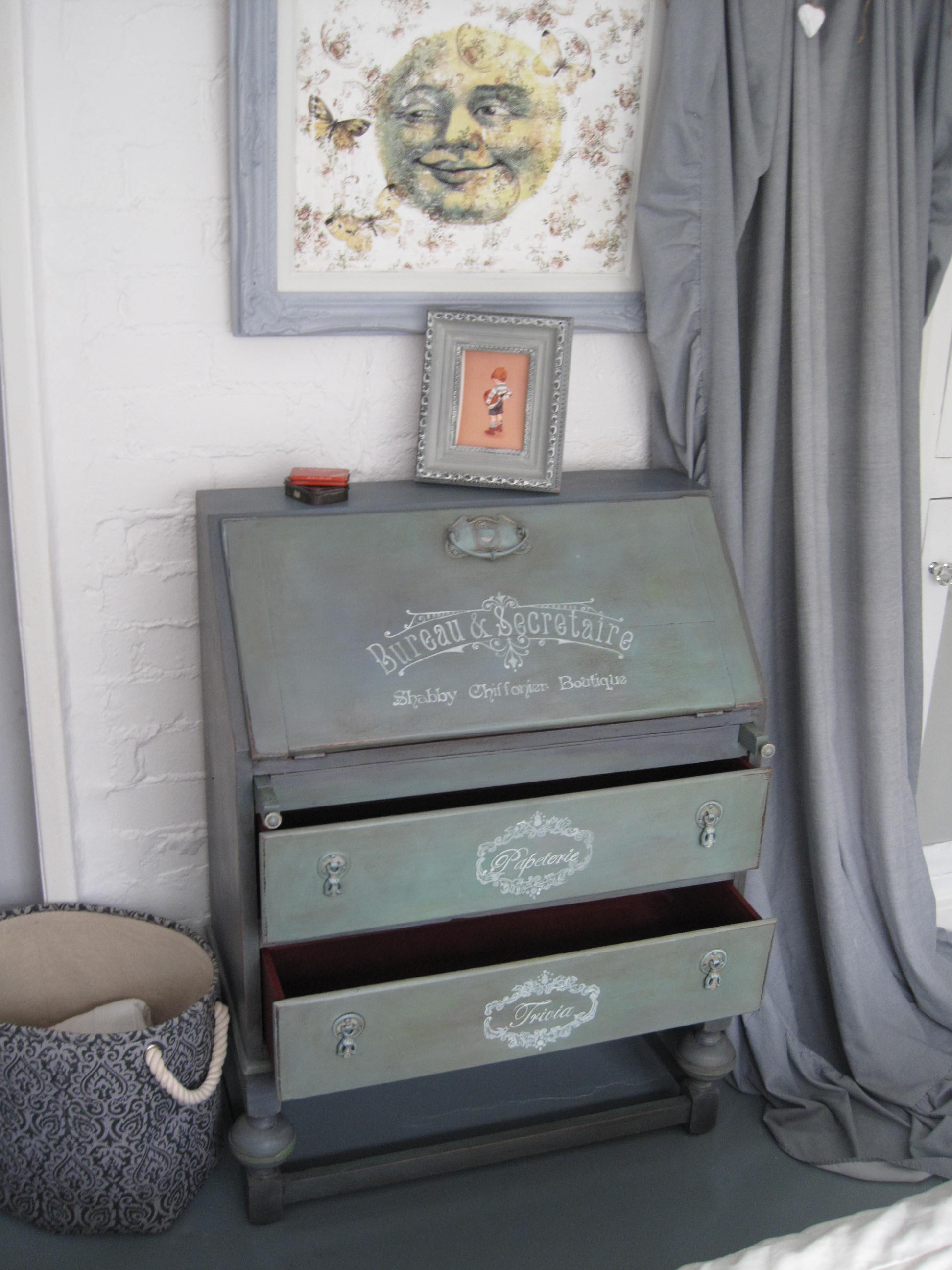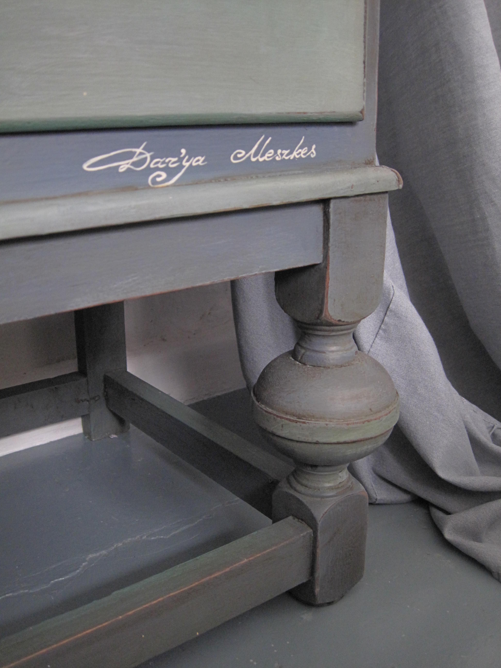 It has been lovingly restored by me into a beautiful Bespoke item. I hand painted whole piece with pastel palette of Annie Sloan paints creatively blended together. I gave the name for colour Aquamarine as this mixture reminds me of the beautiful precious stone. I hope you can see all the beauty of its appearance in those photos . Few layers of paint have been applied to give texture to the surface. A rich deep warm red – Burgundy the colour of dark cherries was applied inside of the drawers and bureau to balance the look. Delicately distressed and signed with my designer signature.