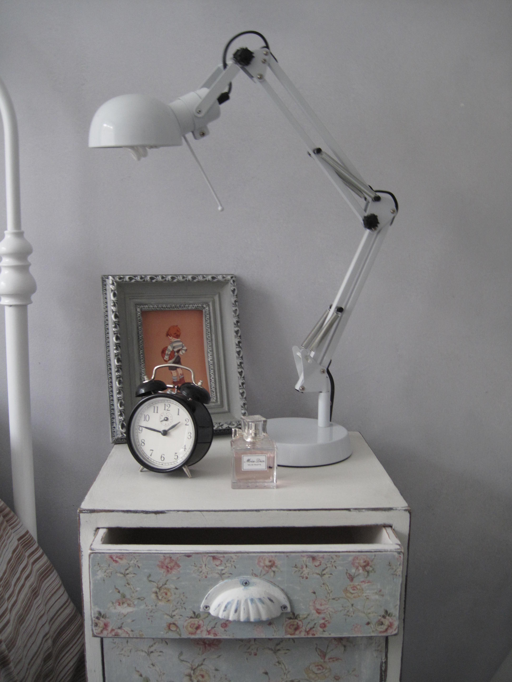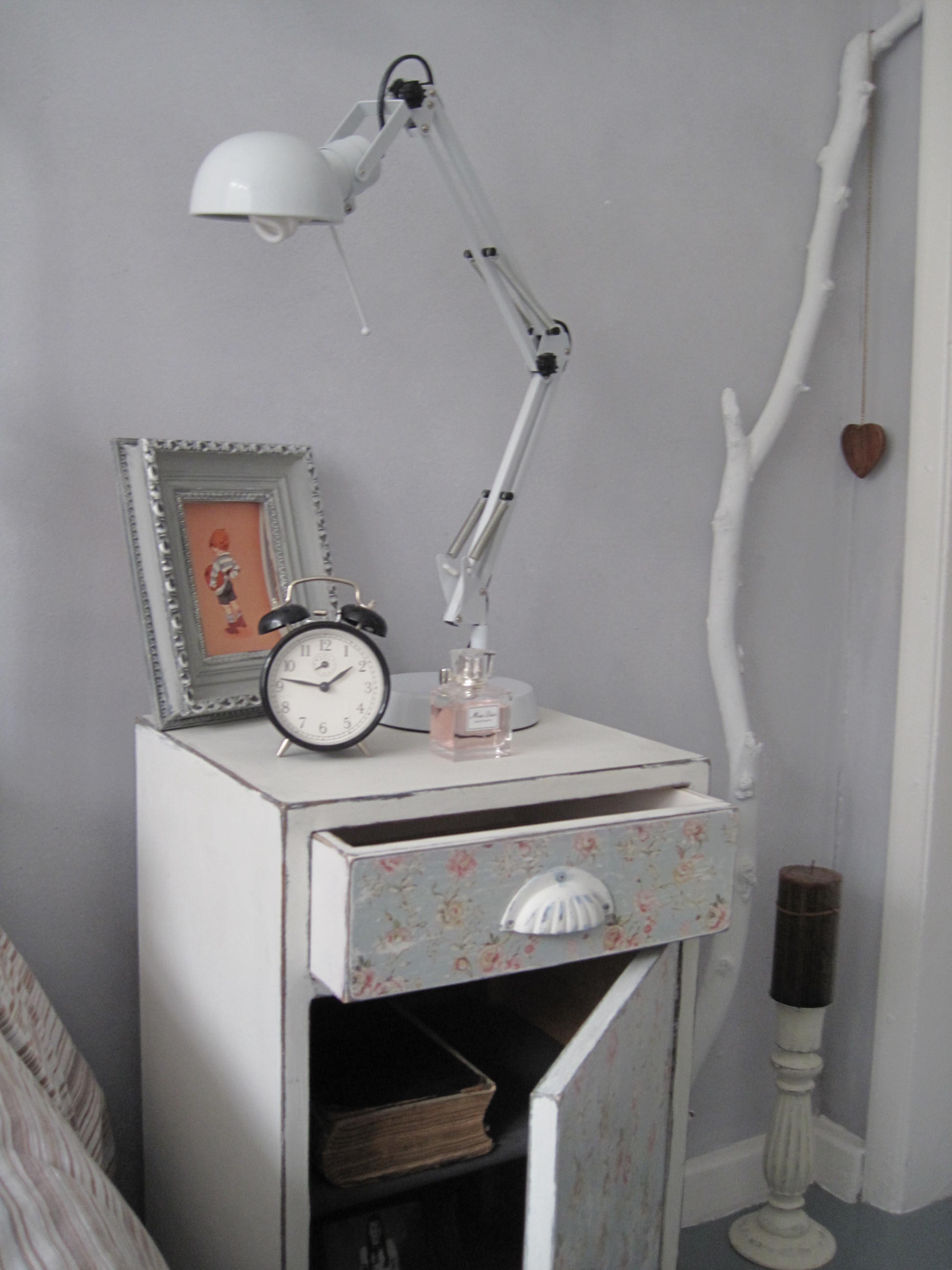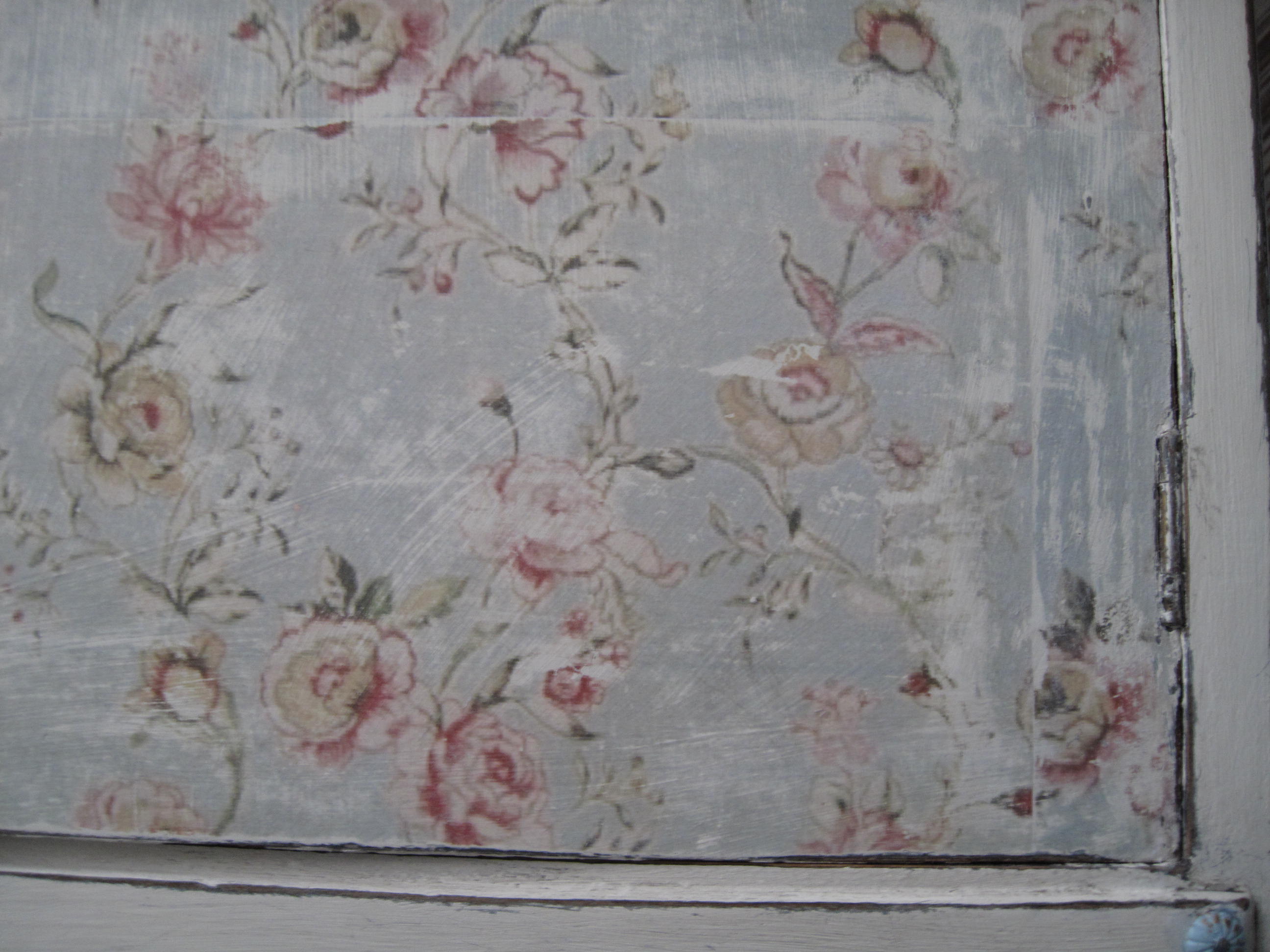 Hand painted with White over Graphite. Decorated with vintage wallpaper motif and hand painted ‘Shabby Chiffonier’ Stamp. Protected with varnish then waxed. Few layers of paint have been applied to give texture to the surface. Heavily distressed and signed with my designer signature.