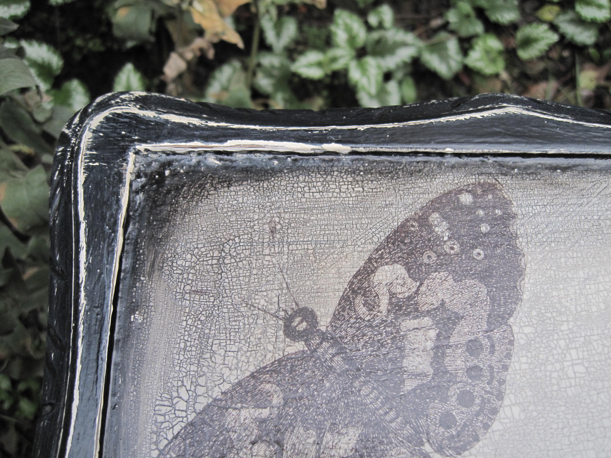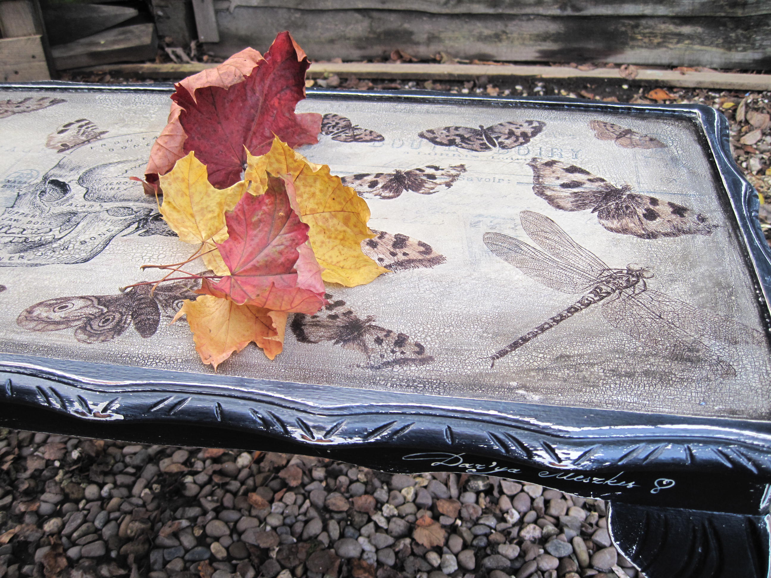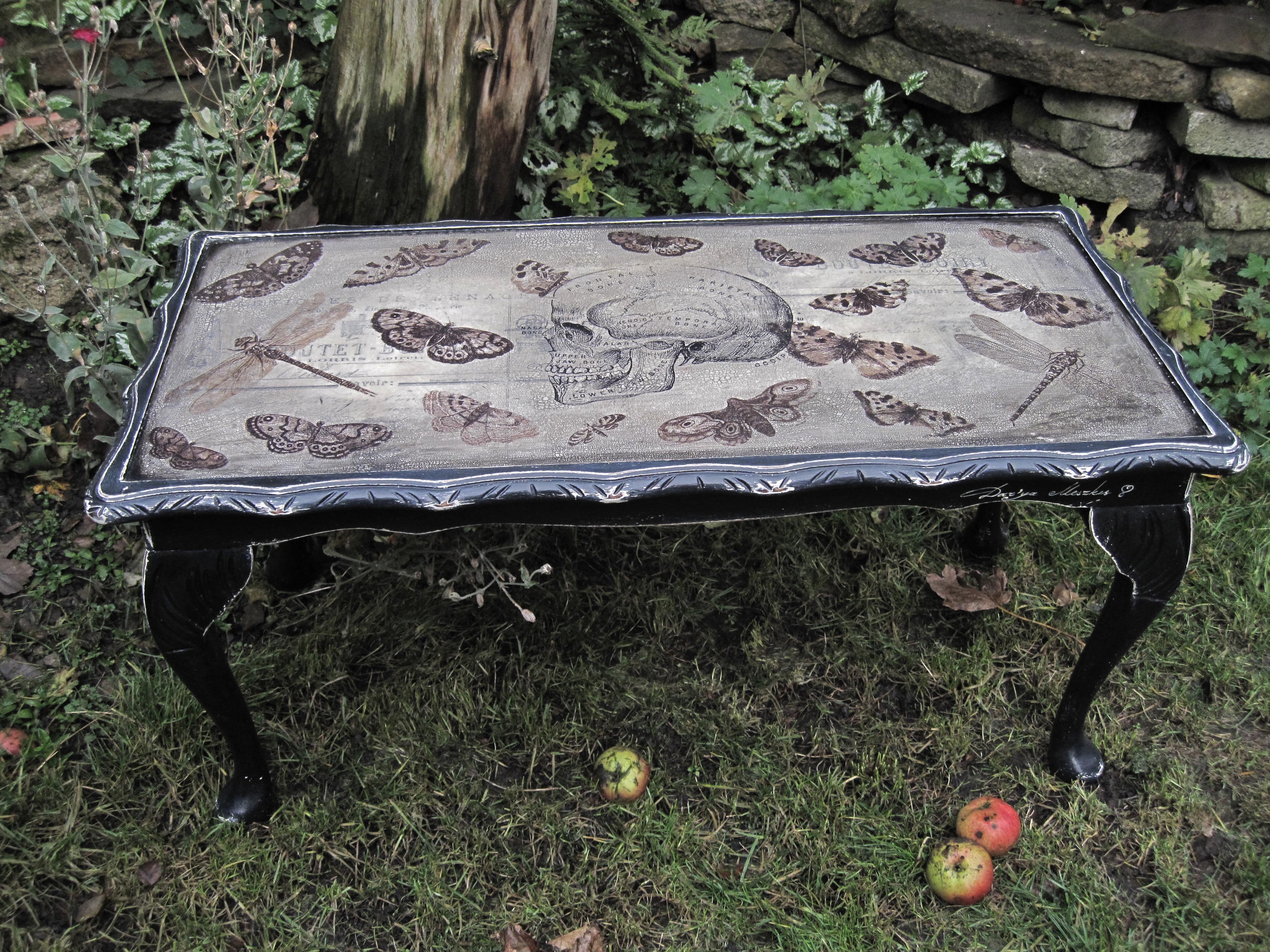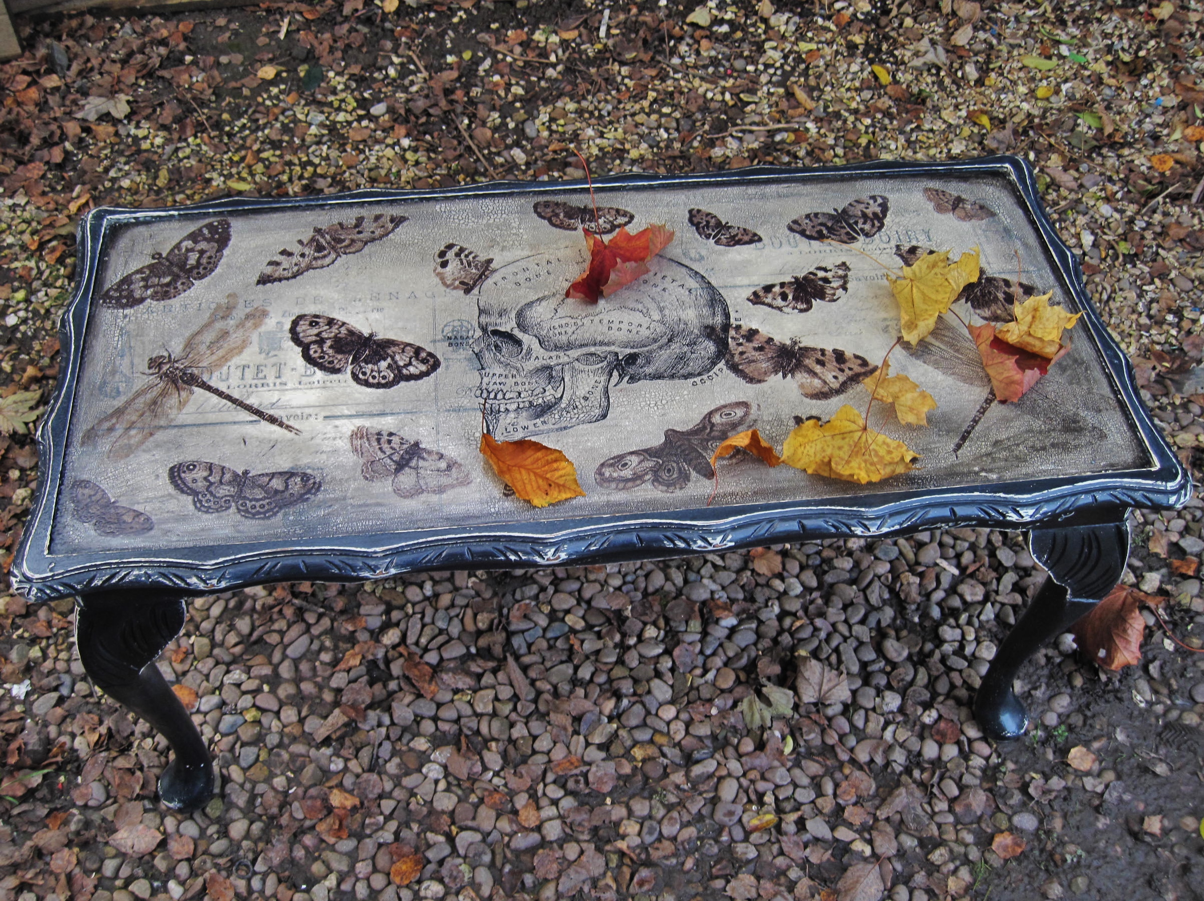 This steampunk look Coffee Table has been finished few days ago. It will be a Quirky feature at his new modern home! Decorated with Skull and Antique Butterflies, painted with Black Satin over Annie Sloan Cream, decorated with crackle effect protected with varnish, signed.