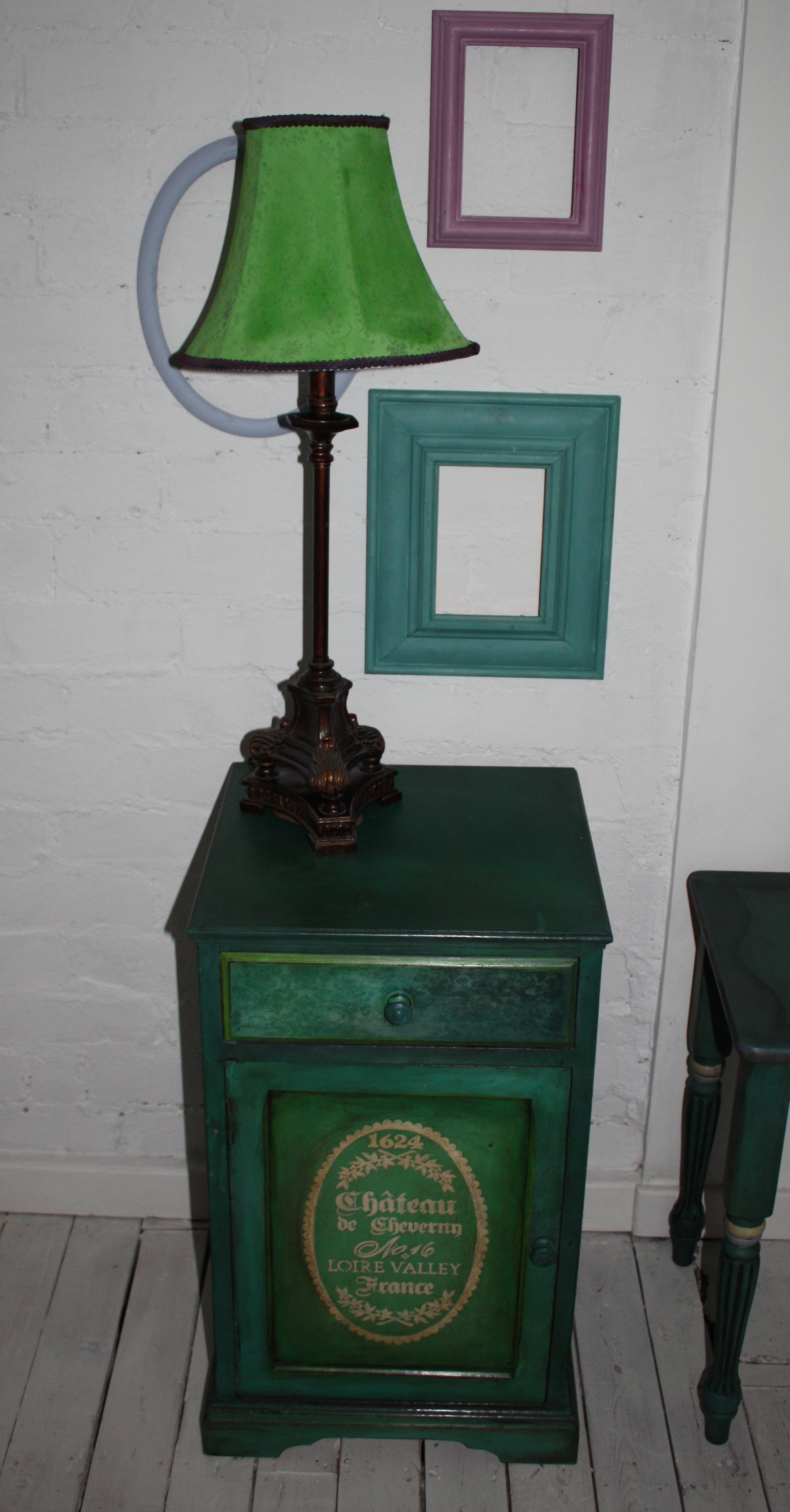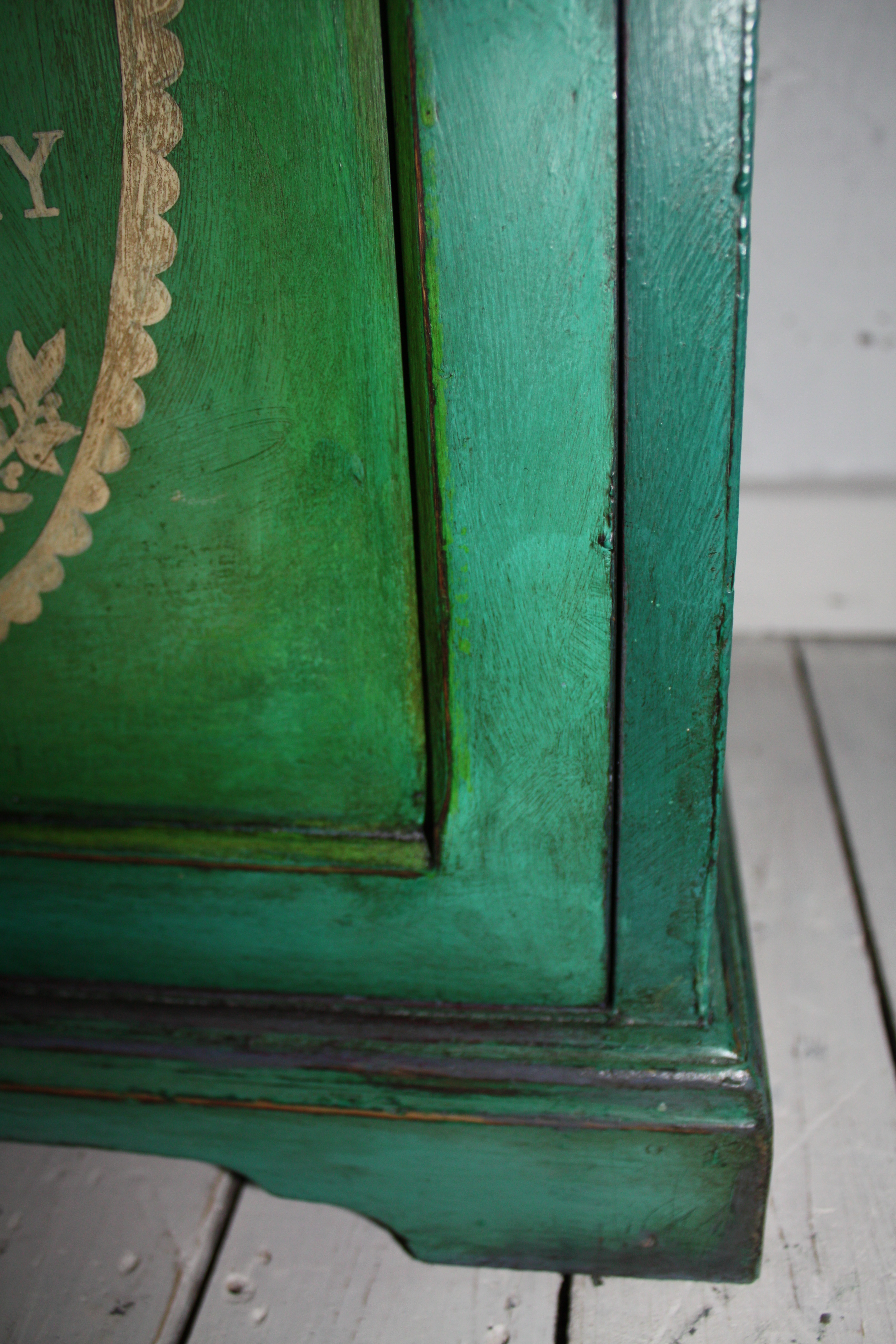 Vintage, good condition cabinet, Hand painted with custom mix of Annie Sloan Chalk Paints. I used 7 colours to create bespoke NAPOLEONIC. Decorated with typography motif. Few layers of paint have been applied to give texture to the surface. Painted inside as well. Heavily aged with dark wax.