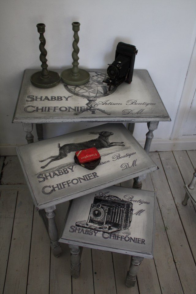 Shabby Urban Loft Nest of 3 Tables Vintage Engravings